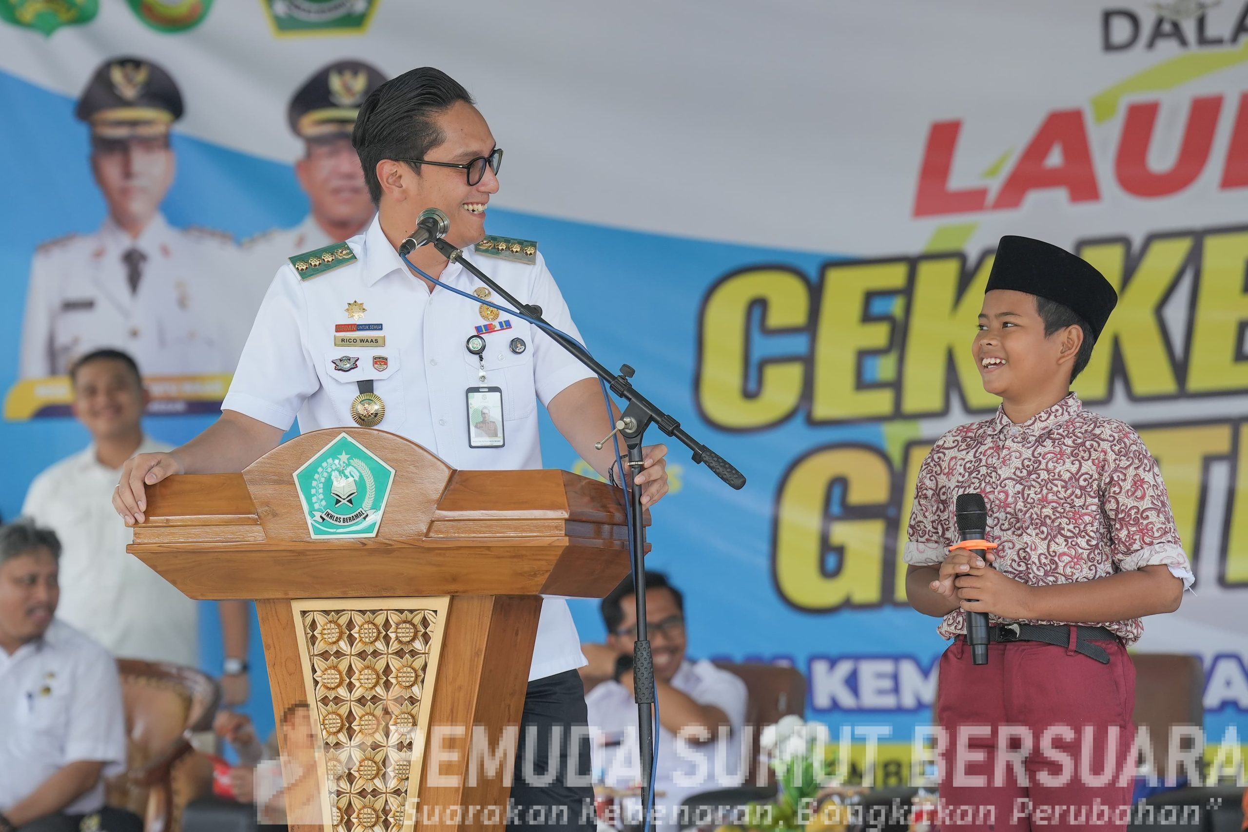 Suasana peluncuran berlangsung meriah. Rico Waas mengajak siswa mengikuti kuis edukatif seputar nama camat, wali kota, menteri, hingga presiden.
