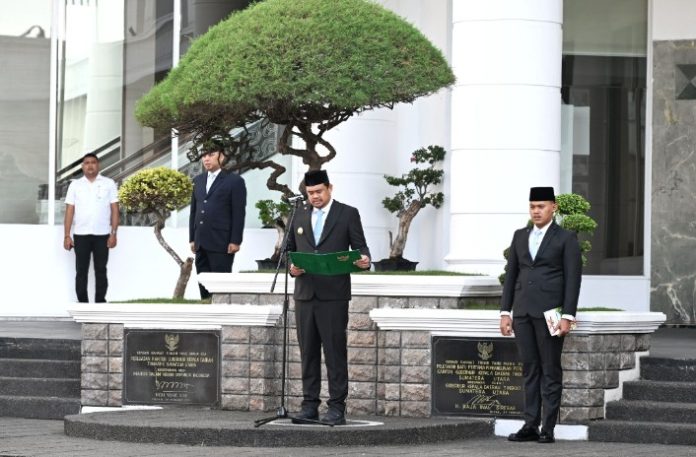 Gubernur Sumatera Utara (Sumut) Bobby Afif Nasution, selaku Inspektur Upacara, membacakan pidato Badan Pembina Ideologi Pancasila Republik Indonesia (BPIP RI) di halaman Kantor Gubernur Sumut, Senin (02/06/2025).