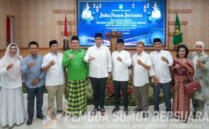 Suasana hangat menyelimuti acara buka puasa bersama Wali Kota Medan, Rico Tri Putra Bayu Waas dengan relawan Rico & Zaki, Partai dan Fraksi DPRD kota Medan di Gedung PKK Kota Medan, Selasa (10/03/2026).
