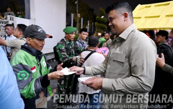 “Jadi kita bagikan tadi paket bingkisan dari Pak Presiden di malam Hari Raya Idulfitri kepada masyarakat, di depan Kantor Gubernur. Saya bersama Menseskab (Teddy Indra Wijaya), ada 2.500 paket bingkisan yang kita bagikan,” ujar Bobby Nasution.