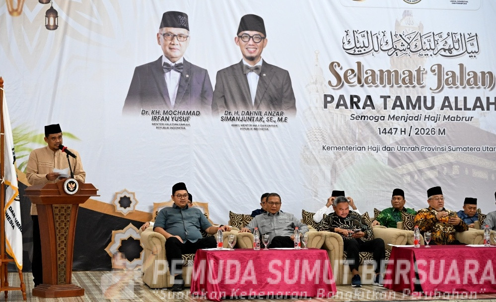 Gubernur Sumatera Utara (Sumut) Muhammad Bobby Afif Nasution melepas jemaah haji Kelompok Terbang (Kloter) 2 Embarkasi Medan di Asrama Haji Medan, Jalan AH Nasution, Selasa malam (22/04/2026). Dalam kesempatan tersebut, Bobby menekankan pentingnya menjaga kebersamaan selama menjalankan ibadah di Tanah Suci.