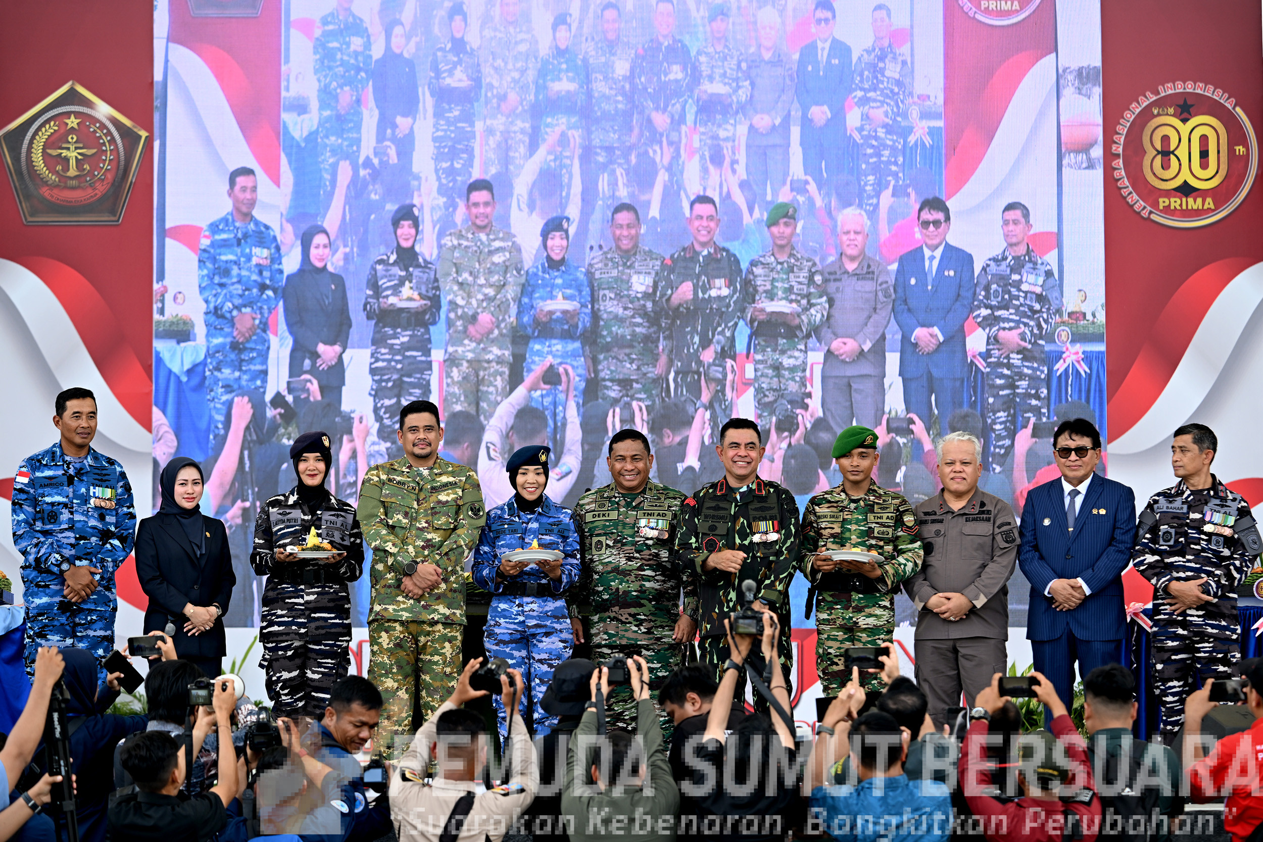 Gubernur Sumatera Utara (Sumut) Bobby Nasution bersama Forum Koordinasi Pimpinan Daerah (Forkopimda) Sumut menghadiri Perayaan Hari Ulang Tahun (HUT) ke-80 Tentara Nasional Indonesia (TNI). Kegiatan yang mengusung tema ‘TNI Prima, TNI Rakyat, Indonesia Maju’, tersebut berlangsung di Lapangan Merdeka Medan, Minggu (5/10/2025).