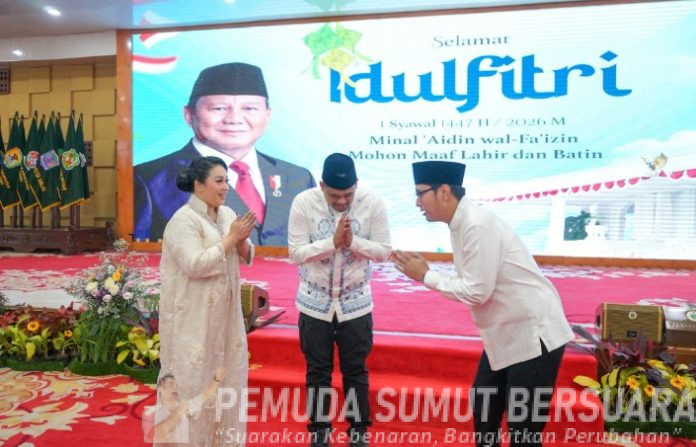 Wali Kota Medan Rico Tri Putra Bayu Waas menghadiri Open House Idulfitri 1447 yang diselenggarakan Gubernur Sumatera Utara Bobby Afif Nasution, Sabtu (21/3/2026).