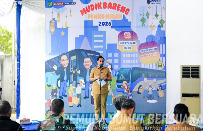 Pelepasan mudik bareng Pemko Medan 2026 ini dilakukan langsung Wali Kota Medan Rico Tri Putra Bayu Waas didampingi Wakil Wali Kota Medan H Zakiyuddin Harahap di Terminal Amplas, Senin (16/3/26). Turut hadir Kakankemenag Kota Medan Impun Siregar, unsur Forkopimda diantaranya Kapolrestabes Medan Kombes Pol Jean Calvijn Simanjuntak, Dandenpom I Medan, perwakilan Dandim 0201/ Medan, perwakilan Kajari Medan dan Kepala BPTD Wilayah II Sumut, Ariyandi Ariyus serta Plt Kadis Perhubungan, Suriono dan segenap Pimpinan Perangkat Daerah.