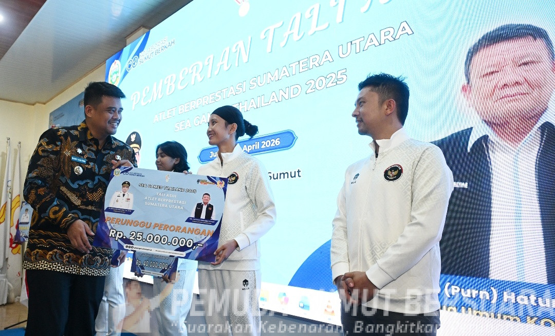 Gubernur Sumatera Utara (Sumut) Muhammad Bobby Afif Nasution menyerahkan tali asih kepada atlet peraih medali pada ajang SEA Games 2025 di Thailand. Pada ajang tersebut, atlet asal Sumut berhasil mengoleksi total 30 medali.