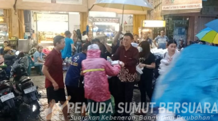 Di bawah derasnya hujan yang mengguyur Kota Medan, Hasyim SE, Ketua DPC PDI Perjuangan Kota Medan, tampak berbaur dengan warga sambil membagikan 750 paket makanan siap saji bergizi. Bersama Komunitas Wu Xing (5 Elemen), ia turun langsung ke lapangan tanpa ragu meski pakaian basah kuyup, menunjukkan kepedulian yang tulus kepada masyarakat kecil, Sabtu (18/10/2025).